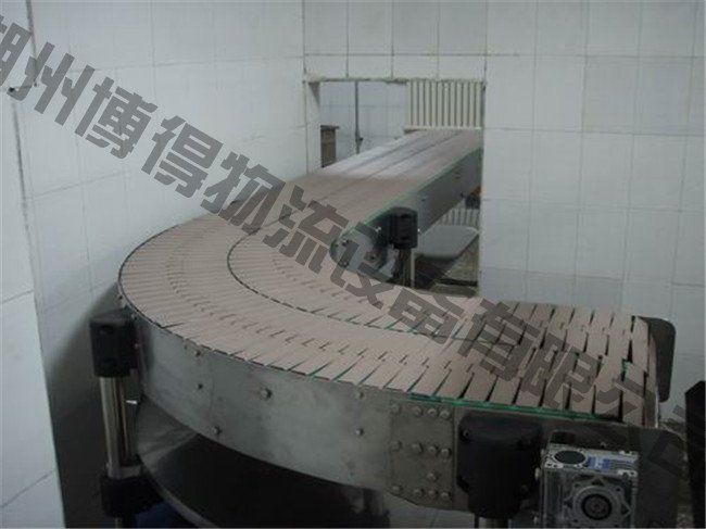 鏈板輸送機以標(biāo)準(zhǔn)鏈板為承載面,由馬達(dá)減速機為動力傳動;我們可以通過多列鏈板并行,使鏈板輸送機做的很寬并形成差速,利用多列鏈板的速度差使多列輸送在無擠壓的情況下變?yōu)閱瘟休斔?,從而滿足飲料貼標(biāo)、灌裝、清洗等設(shè)備的單列輸送的要求,我們可以將兩條鏈板輸送機的頭尾部做成重疊式的混合鏈?zhǔn)沟闷浚ü蓿w處于動態(tài)過度狀態(tài),使輸送線上不滯留物料,可以滿足空瓶以及實瓶壓力和無壓力輸送。