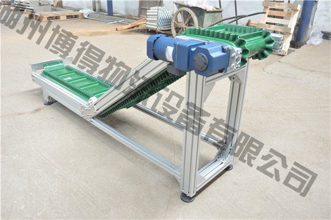 (1)爬坡輸送機為一般用途的散狀物料連續(xù)輸送設備,但采用的是具有波狀擋邊和橫隔板的輸送帶。因此,特別適用于大傾角及垂直90°輸送。